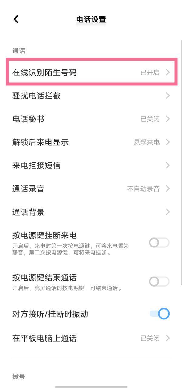 进入之后,点击【电话】,关闭在线识别陌生号码即可(操作如下图所示)。