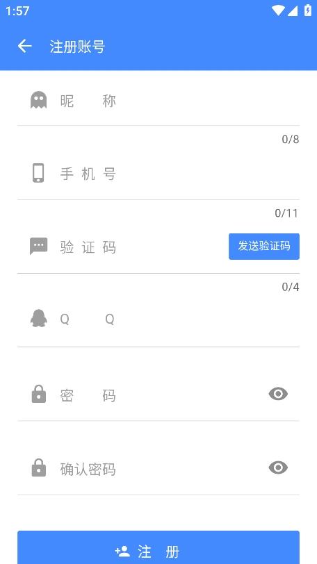 3、如果没有账号,可以点击下方的注册账号,填写昵称、手机号、验证码、qq、密码登信息,即可注册。