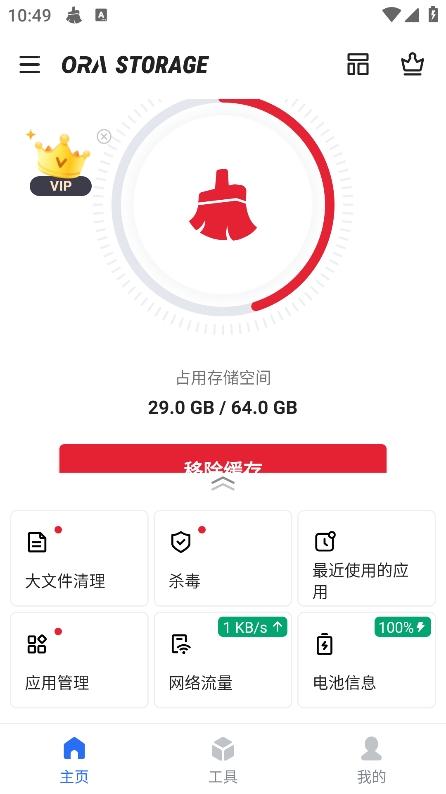 1、进入软件,你可以在主页发现缓存清理、大文件清理、杀毒、应用管理、流量监控等功能;