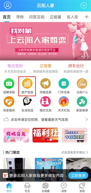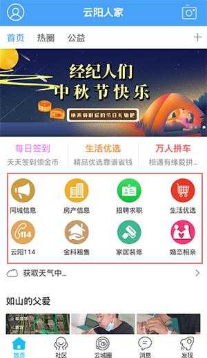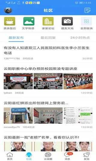 1、在本站下载安装云阳人家app,在手机上运行软件,可以看到有首页、社区、云城圈、消息、发现五个板块;